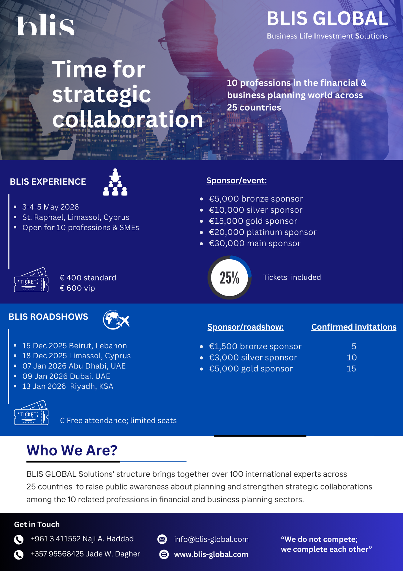 BLIS Global (Business Life Investment Solutions) is proud to announce the launch of an ambitious international initiative designed to bridge the gap between ten distinct financial and business planning professions. The initiative begins with the BLIS Roadshows—a five-city tour across the Middle East and Cyprus in late 2025 and early 2026—culminating in the flagship BLIS Experience summit in May 2026.