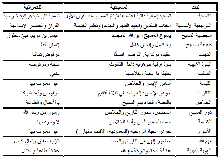 يمتدّ التباين بين المسيحية والنصرانية إلى مختلف المستويات، كما يبيّنه الجدول الآتي: من طبيعة المسيح، إلى فهم الله، إلى معنى الخلاص، إلى دور الكنيسة، وصولًا إلى العلاقة بين السماء والأرض. فبينما ترى المسيحية الله حاضرًا في التاريخ ومتجسّدًا في الجسد، تصوّر النصرانية إلهًا متعاليًا منفصلًا عن الجسد والتاريخ. وبينما تفهم المسيحية الخلاص بوصفه فعلًا إلهيًا يتمّ بالنعمة، تنظر إليه النصرانية كمسار أخلاقي تشريعي. كذلك، في حين ترى المسيحية في المسيح محور التاريخ وغايتَه، تراه النصرانية مجرّد حلقة ضمن سلسلة من الأنبياء.