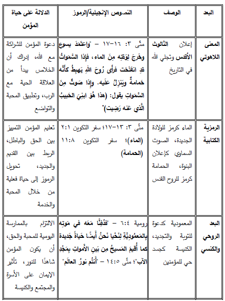 يتكامل البعد الرمزي مع البعد التكويني، لأن المعمودية تُعلن بداية عهد جديد، حيث يظهر الرب في الواقع البشري وليس كقوة بعيدة. فالظهور في نهر الأردن، وهو نهر عابر للحدود ومكان حياة وعمل، يذكّر المؤمنين أن رسالة المسيح ليست حكرًا على النخبة، بل موجّهة لكل إنسان، في كل زمان ومكان. وهنا، تصبح الرمزية الكتابية دعوة للتأمل في المعاني الأخلاقية: التواضع، التضامن، والمصالحة، وهي قيم مركزية في حياة المسيح التي تبدأ بالظهور العلني في عيد الدنح.