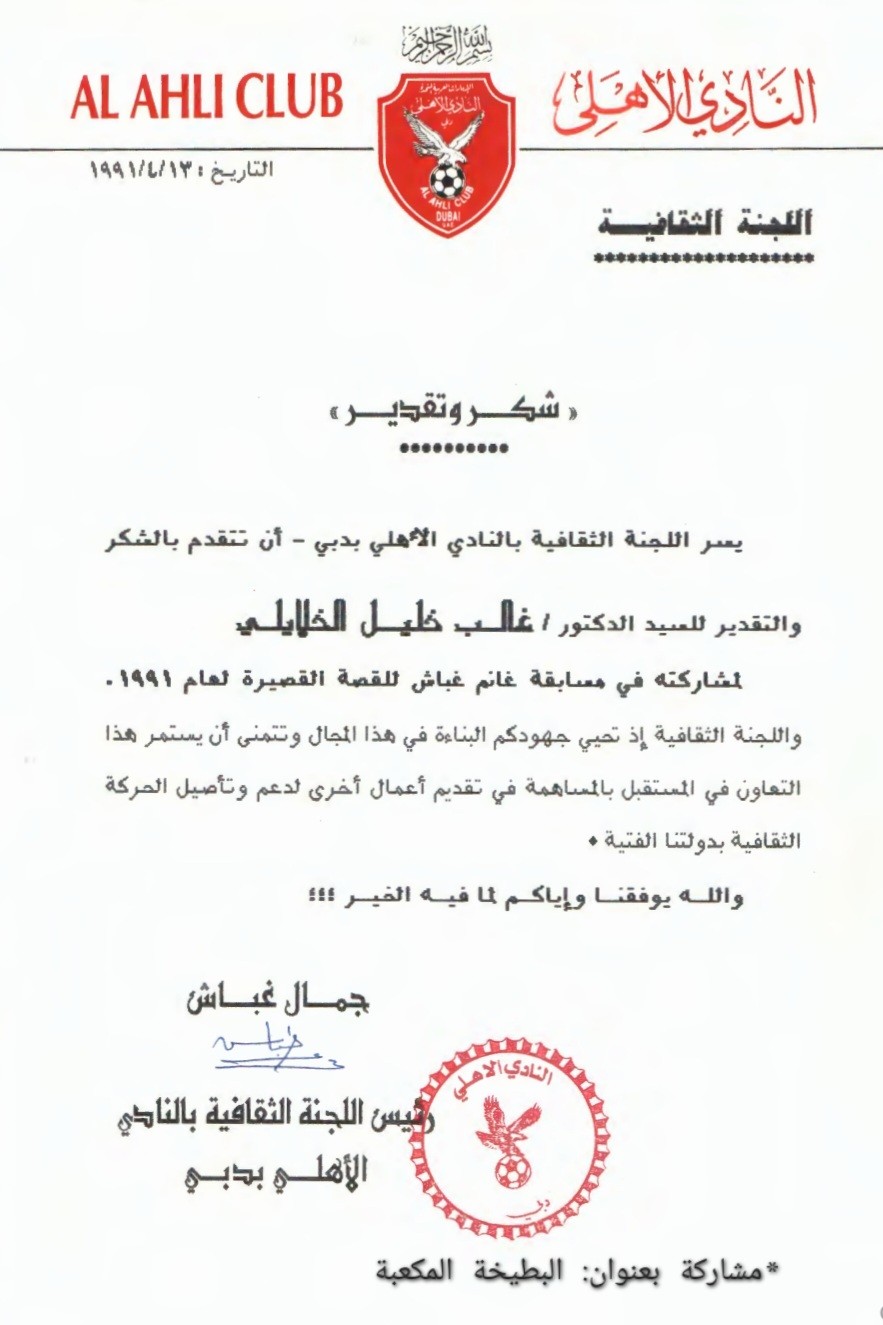 المفاجأة هي أن قصتي فازت بجائزة، وكان عرسَ فرحٍ لم أتوقعه، إذ نُشر خبرُ الفوز في كل الصحف المحلية (الاتحاد، الخليج، البيان، الوحدة)، يوم 11 نيسان 1991، كما نُشرت القصة في جريدة الاتحاد بعد نحو سنة، يوم الرابع من نيسان 1992.