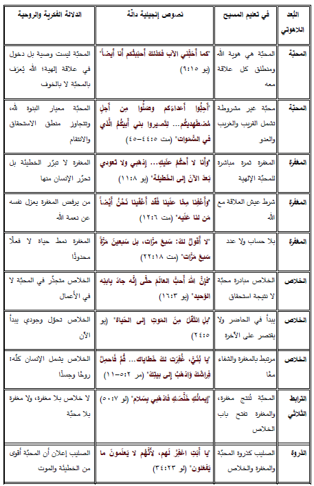 يكشف الجدول التالي أن تعليم المسيح لا يعالج المحبّة والمغفرة والخلاص كموضوعات منفصلة، بل كمسار واحد متكامل: المحبّة هي المصدر، المغفرة هي الفعل، والخلاص هو الثمرة؛ فحيث تُعاش المحبّة، تُمارَس المغفرة، وحيث تُمارَس المغفرة، يبدأ الخلاص. وهكذا، لا تقوم المسيحية على الخوف من الدينونة، بل على الثقة بمحبّة تُعيد خلق الإنسان وتفتح له أفق الحياة الجديدة.
