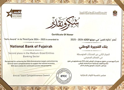 ومع استمرار دولة الإمارات في إعطاء الأولوية لتطوير المواهب الوطنية، يظل بنك الفجيرة الوطني ملتزماً لعب دور ريادي في تشكيل قطاع مصرفي تنافسي وشامل. فضلاً عن أن هذا التكريم يُعزّز مكانة البنك كمؤسسة مالية ذات هدف واضح تضع التنمية الوطنية وتمكين المواهب في صميم استراتيجيتها.