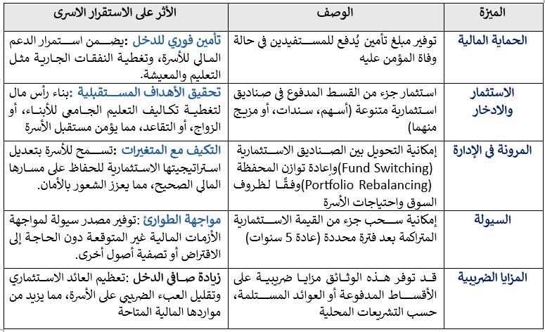 – تعمل وثيقة التأمين الاستثماري كأداة استراتيجية لضمان استقرار الأسرة من خلال معالجة المخاطر المالية على جبهتين:
