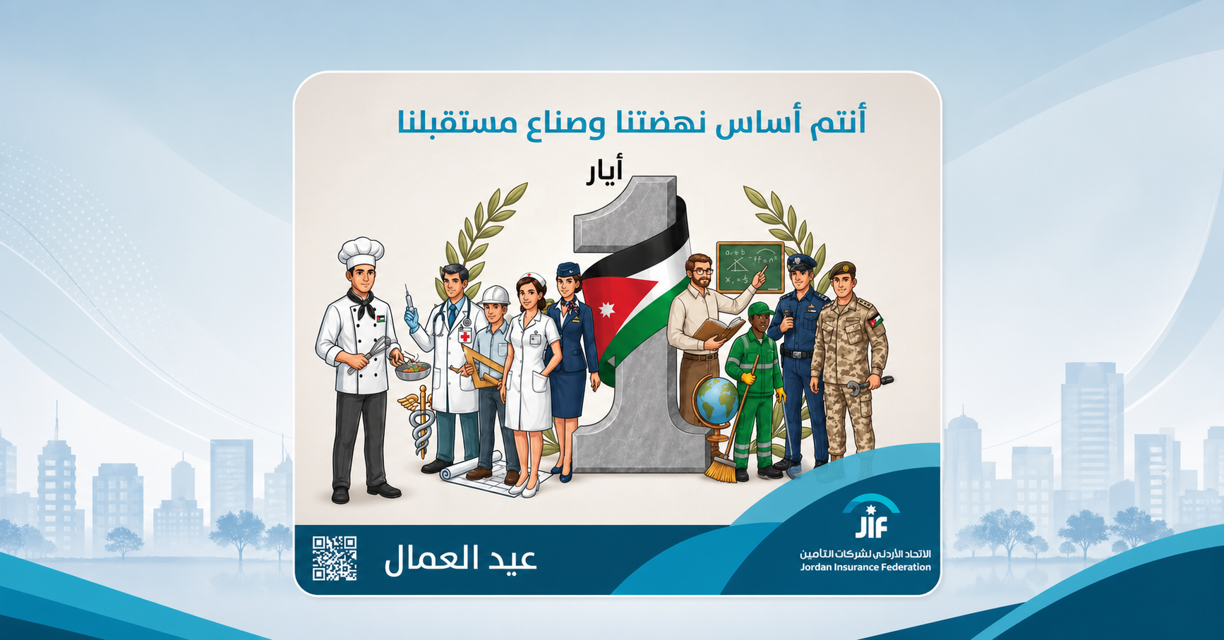 سقتُ هذه المقدمة لأقول أن الأردن خصّص لهذه المناسبة اهتماماً غير مسبوق، و لو انه لم يقصّر يوما لناحية الاهتمام بها. وما لفت هو احتفاء الإتحاد الأردني لشركات التأمين بهذا العيد وإصداره ملصقاً جمع رموز هذه المناسبة، أيّ العاملين في الوطن جميعاً: الجندي والشرطي والدركي وعامل التنظيف والمدرّس والممرض والطبيب والطاهي الذين يمثلون أركان الوطن، مع علم البلاد (المملكة الأردنية) وشعار: “أنتم أساس نهضتنا وصنّاع مستقبلنا”.