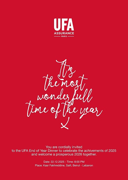 بالمناسبة نُشير الى ان UFA وانسجاماً مع الأجواء التفاؤلية، دعت شركاءها في قطاع التأمين وهم الوسطاء وزملاء المهنة الى عشاء سيُقام في فندق قصر فخر الدين (مقره الرئيسي برمانا) الذي افتتحت إدارته فرعاً في منطقة الصيفي في بيروت وذلك يوم 22 من الشهر الجاري الثامنة مساءً.